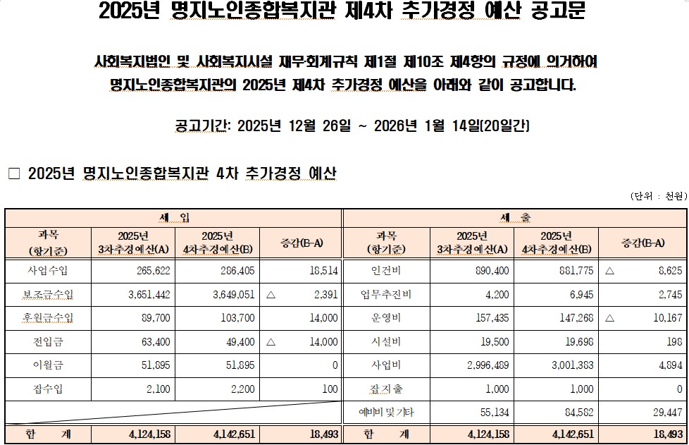 2025년 명지노인종합복지관 제4차 추가경정예산 공고 > 투명운영